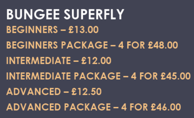 Programs: Bungee beginners induction, regular bungee sessions, progression levels and class passes (they advertise PAYG, bundles and memberships on affiliated pages).