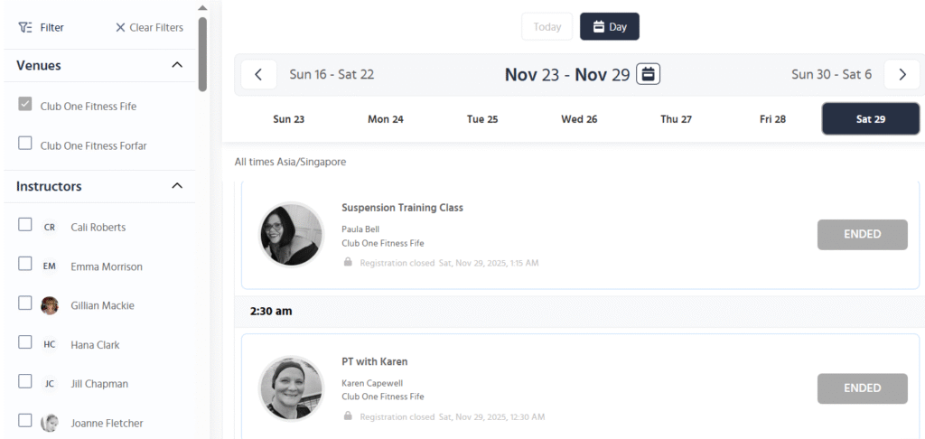 Instructors: Club lists its studio instructors on social channels and class pages — classes are led by named club coaches (examples shown in social posts). Contact the club to confirm current teacher roster.