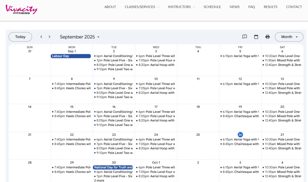 Class schedule: Available via the Vivacity “View our Classes” / booking page. Schedules for workout are available from Monday to saturday.